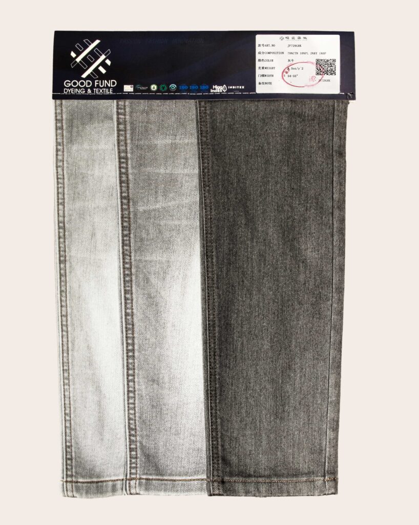 这款面料由79%棉、18%涤纶、2%人造丝和1%氨纶混纺而成,融合天然与功能的优势。棉占比高,柔软透气,带来舒适的穿着体验;涤纶增强耐用性与抗皱性,延长使用寿命;少量人造丝增添光泽与垂感,提升质感;氨纶则赋予微弹效果,贴合身形。适合打造既经典又实穿的牛仔单品,兼顾舒适与时尚实用性。