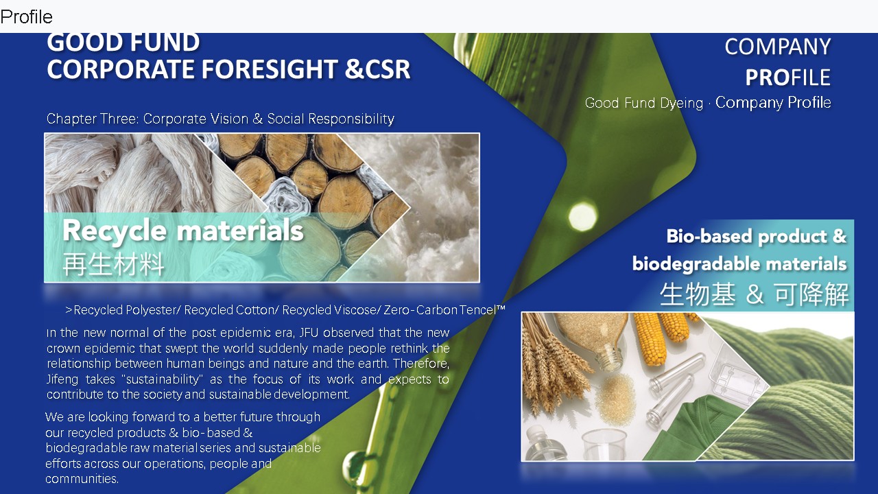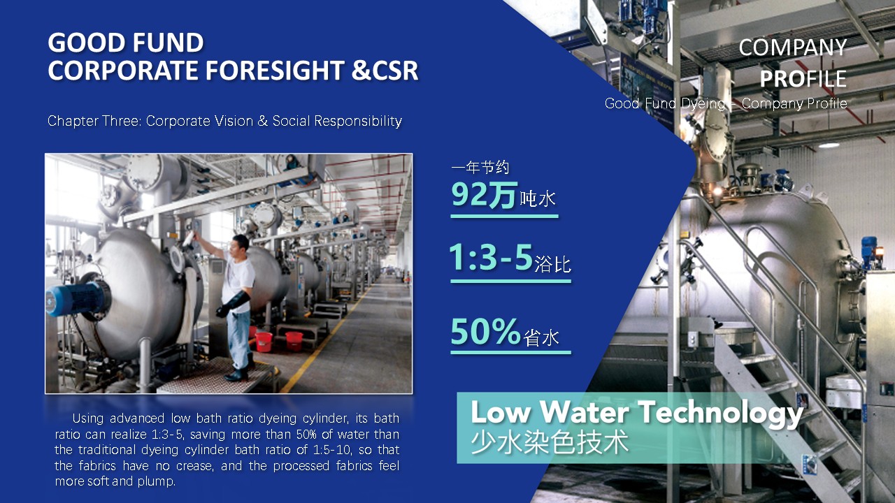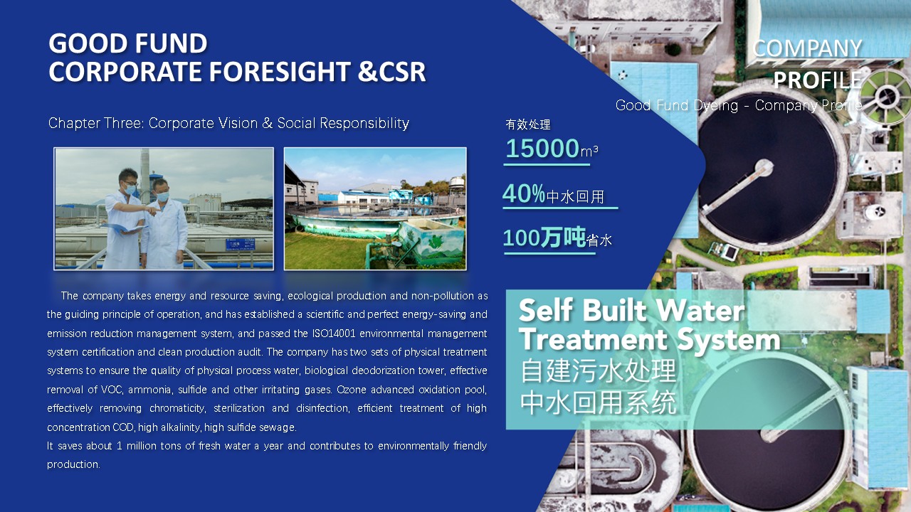 完善的废水处理系统意味着违反环境法规的风险较低。 这也是为什么我们能够将合适的产品在合适的时间和地点交付给合适的客户。 作为一家负责任的公司,面料仅使用环保原材料,如有机棉、再生棉、再生纤维等。 从小细节到数百万的大交易,可持续发展和自然资源的生产始终被纳入考虑,以尊重和热爱自然,抓住每一个机会并珍惜我们所拥有的一切,这是面料生产、创造和创新的主要动力,也是通向更美好未来的唯一道路。