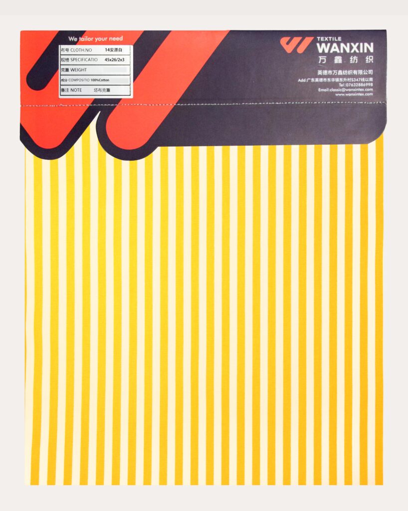 这款100%棉(Cotton)帆布面料点缀黄色与白色竖纹,带来清新与经典的碰撞。全棉材质柔软透气,吸湿耐用,赋予厚实舒适的天然质感;黄白竖纹设计增添明亮活力与简洁线条美,视觉清爽时尚。适合打造耐磨实用的帆布单品,如背包或服饰,融合自然魅力与现代感。