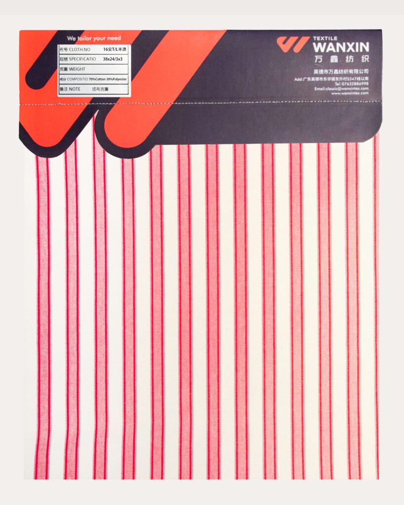 这款帆布面料由70%棉(Cotton)和30%涤纶(Polyester)混纺,饰以红白相间等宽竖条纹,展现经典与活力的融合。棉带来柔软透气的舒适感;涤纶增强耐磨与抗皱性,耐用实用;红白条纹均匀分布,色彩鲜明,带来醒目而平衡的视觉效果。适合打造坚韧时尚的帆布单品,如包袋或服饰,兼具风格与功能。
