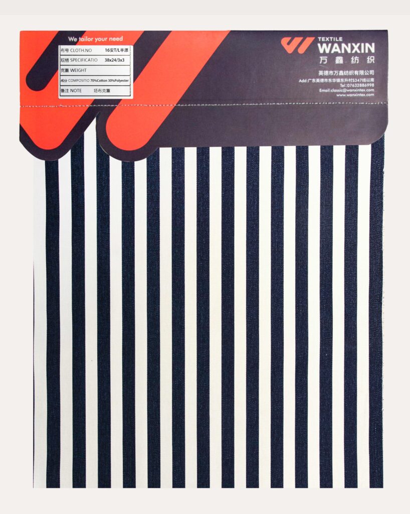 这款帆布面料由70%棉(Cotton)和30%涤纶(Polyester)混纺,饰以蓝白相间等宽竖条纹,展现简约与现代感的融合。棉带来柔软透气的舒适体验;涤纶增强抗皱耐磨性,实用耐久;蓝白条纹均匀分布,经典对比鲜明,视觉干净利落。适合打造时尚耐用的帆布单品,如背包或服饰,兼具实用功能与 timeless 风格。