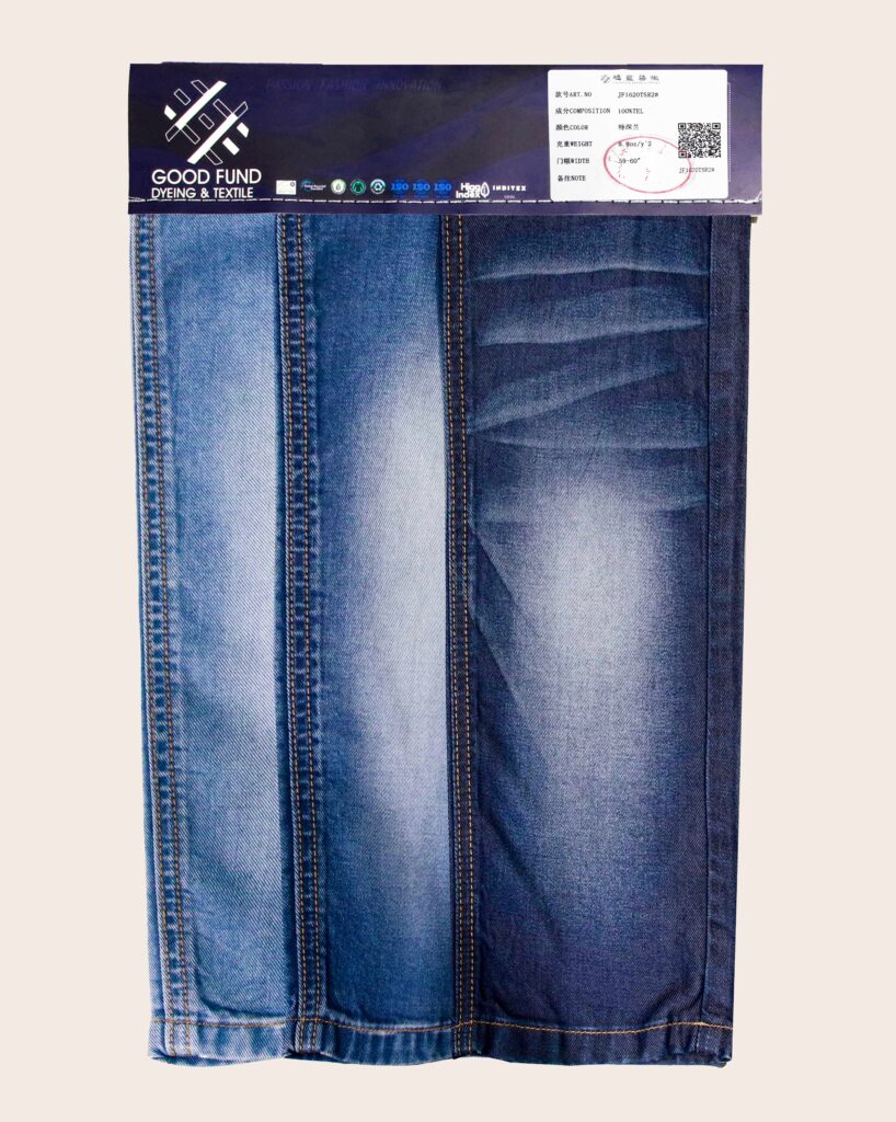 这款100%TEL(天丝纤维)牛仔面料采用纯天丝制成,带来丝滑柔软的触感与卓越的透气性。天丝纤维源于可持续木浆,环保亲肤,吸湿性强,能有效调节体感温度,穿着清爽舒适。其天然光泽与优异的垂坠感赋予牛仔独特的高级质感,适合打造轻盈优雅又具环保理念的时尚单品。
