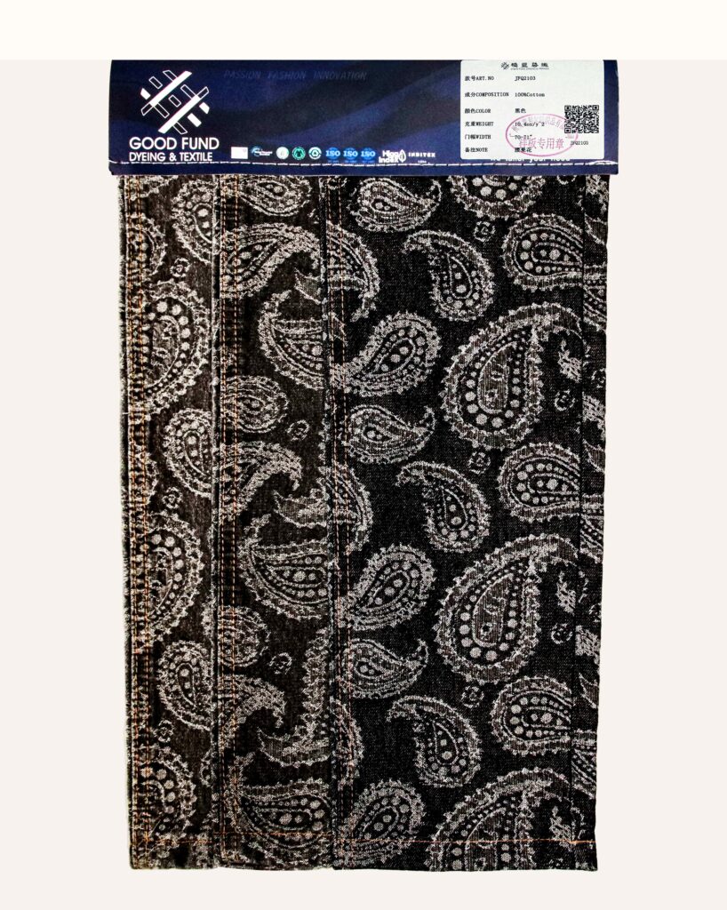 这款面料由98%棉(Cotton/CTN)和2%氨纶(SPX)混纺,搭配腰果花图案,融合舒适与艺术感。棉带来柔软透气与亲肤耐穿的天然质感;氨纶增添微弹,贴合身形;腰果花图案以其流畅曲线与独特东方韵味,提升面料的时尚层次。适合打造自然舒适又具个性美感的牛仔单品。
