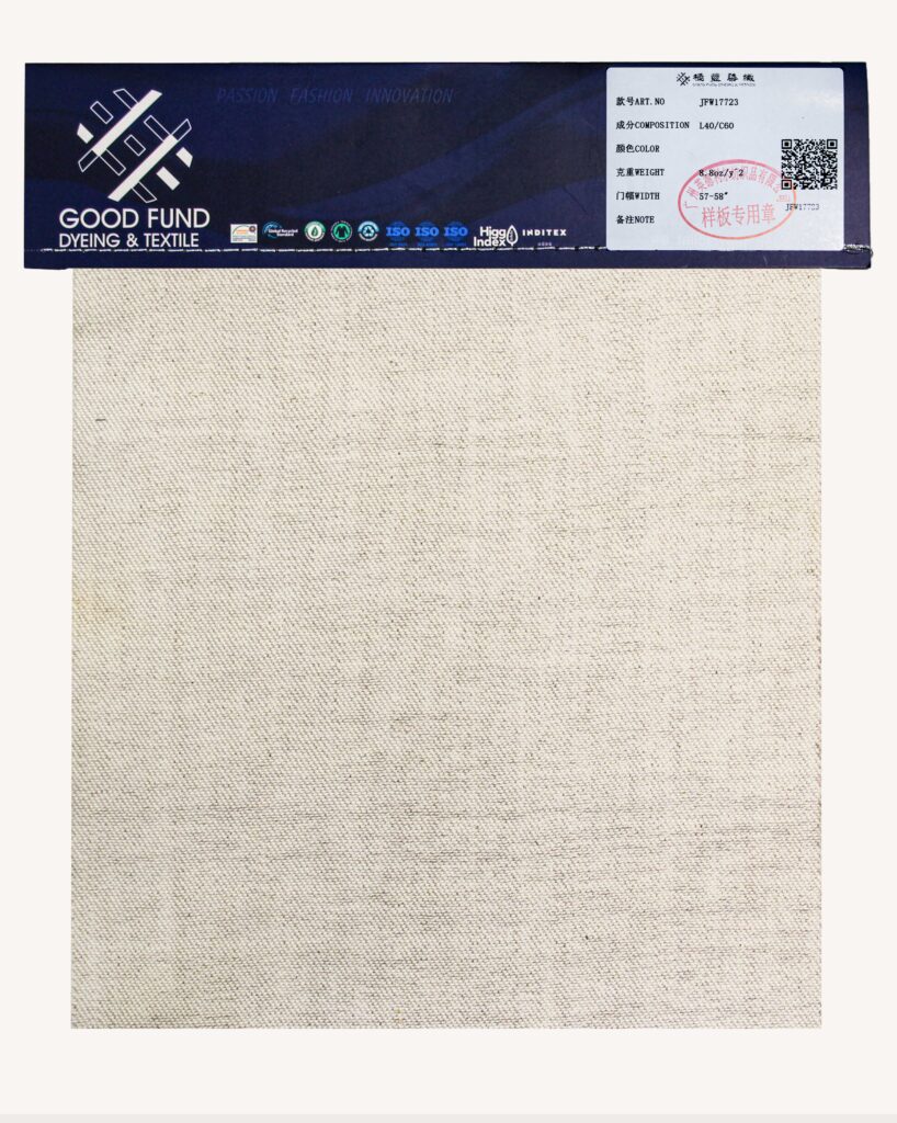 这款面料由30%亚麻(L)和70%棉(C)混纺,呈现亚麻质感,融合舒适与自然风貌。棉占比高,柔软透气,贴合肌肤;亚麻带来清爽触感与天然粗糙美感,提升透气性与层次感。亚麻质感打造出简约而不失格调的风格,适合制作轻盈耐用的面料单品,展现自然生活的轻松态度。