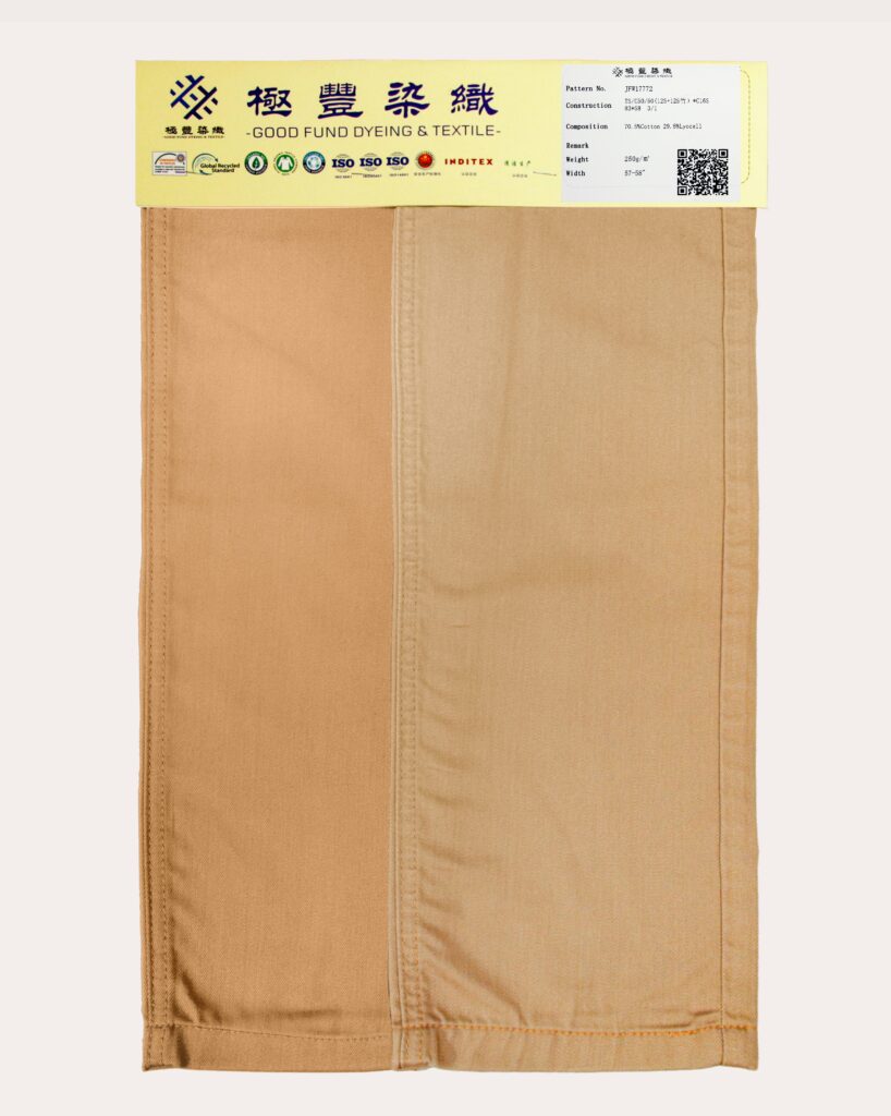 这款细斜纹面料由70.5%棉(Cotton)和29.5%莱赛尔(Lyocell)混纺,融合自然与环保特性。棉带来柔软透气的舒适触感,亲肤耐穿;莱赛尔增添丝滑质感与优异吸湿性,环保轻盈。细斜纹设计赋予面料细腻纹理与微光泽,提升耐用性与优雅感,适合打造清爽精致的休闲单品。
