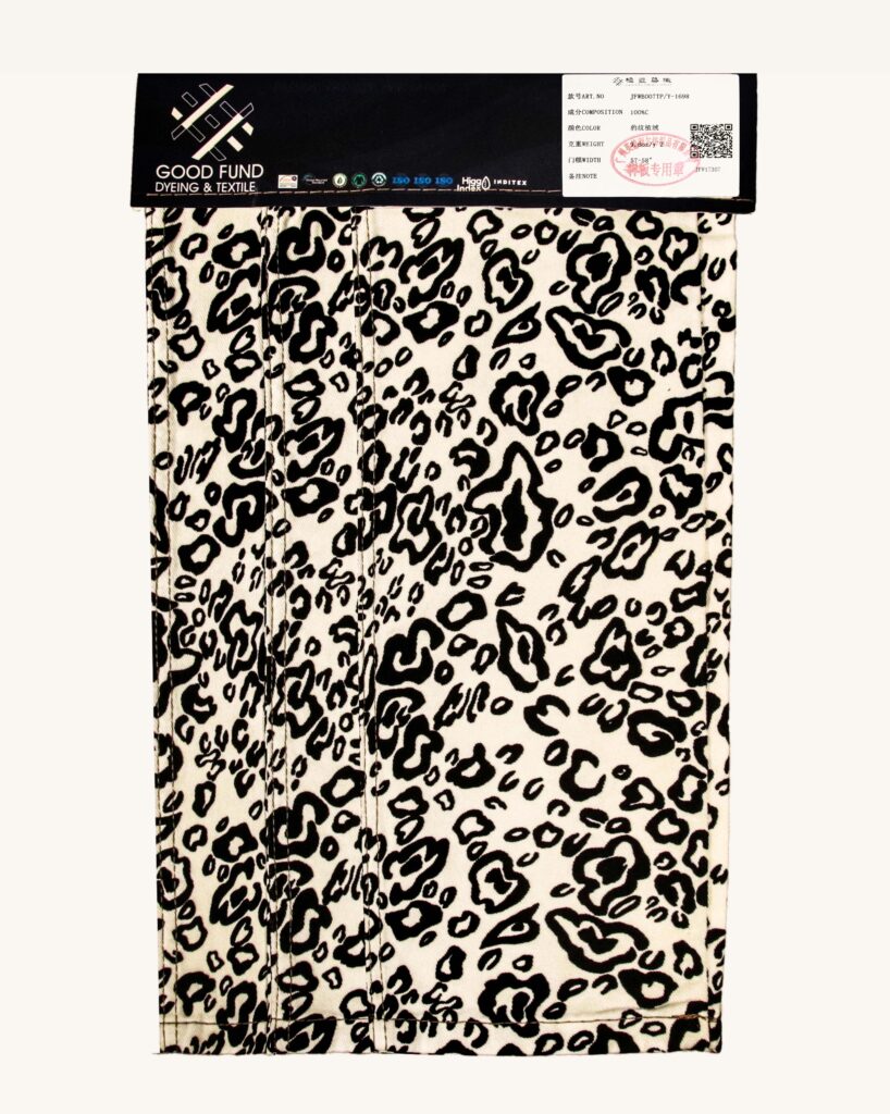 这款100%棉(C)面料以纯棉打造,融入豹纹植绒图案工艺,兼具天然舒适与野性魅力。棉纤维柔软透气,亲肤耐穿;豹纹植绒工艺增添立体触感与时尚张力,视觉效果生动前卫。适合塑造兼顾自然舒适与潮流个性的面料单品,独特工艺与纯粹材质完美结合。